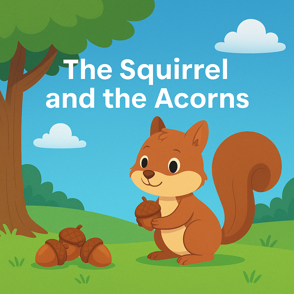 One sunny morning, a little squirrel named Pip was busy collecting acorns. He found a big pile under a tree and thought,